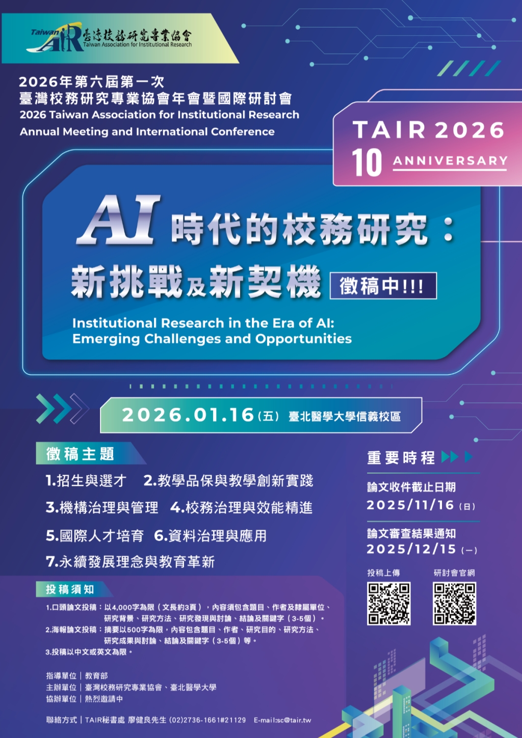 研討會主題:2026第六屆第一次臺灣校務研究專業協會年會暨國際研討會-AI時代的校務研究:新挑戰及新契機